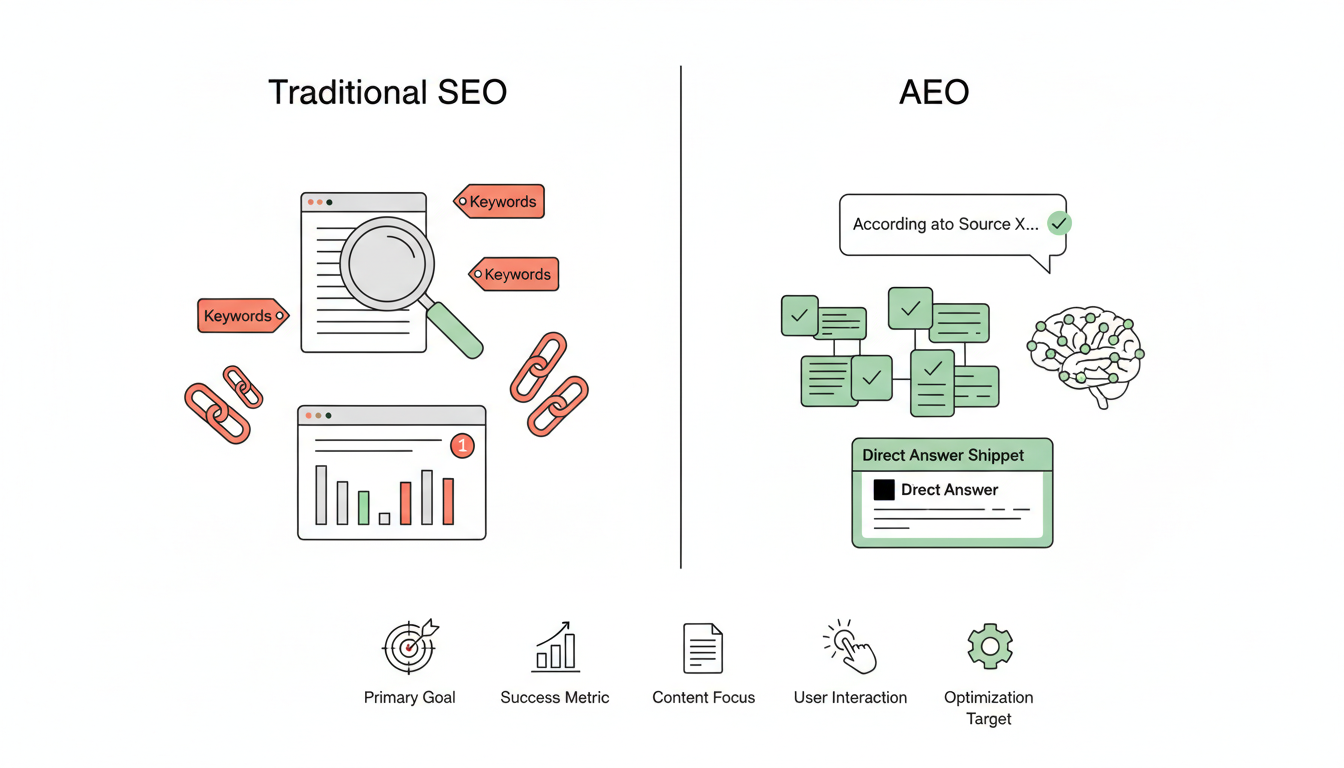 According to Addlly.ai's analysis of AEO, AEO prioritizes structuring your content for clarity and delivering information in formats that AI can easily parse and present to users. This approach differs significantly from traditional techniques covered in what-is-aeo-vs-seo guides, which focus primarily on search engine rankings.