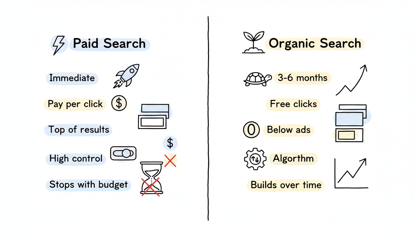 Most successful businesses use both approaches—paid search for immediate results and testing, organic search for long-term sustainable growth.