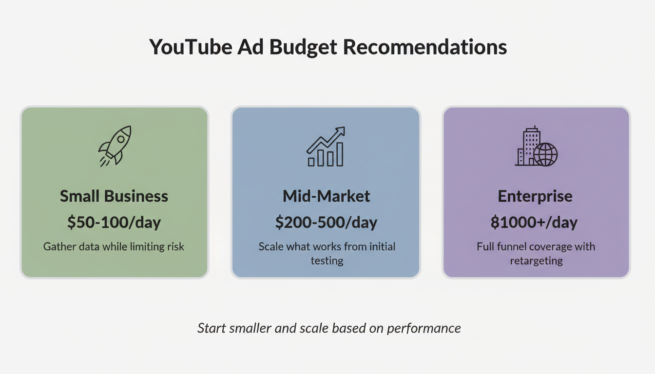 Enterprise | $1000+/day | Full funnel coverage with retargeting |